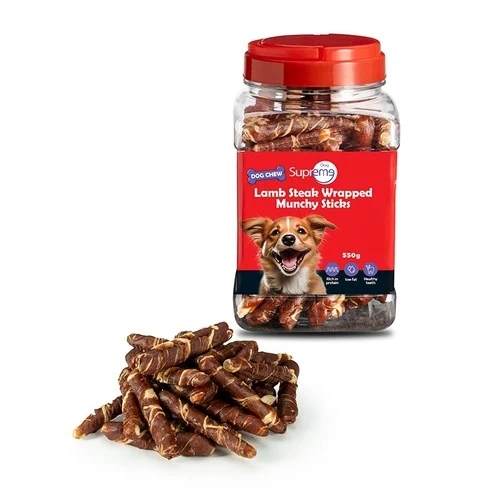 סופרים – חטיף לכלב מקלוני מאנצ'י מצופים כבש בצנצנת 550 גרם