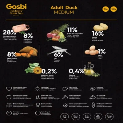 רכיבים: בשר ברווז מיובש 27%, תפוח אדמה 16%, שומן ברווז (מועשר בויטמין E), ברווז טרי 8%, בטטה 8%, תפוח עץ 7%, דגים 6%, שמן סלמון, חלבון ברווז, פירות וירקות 4% – אגס, סלק, גזר, עגבנייה, אננס), שמרי בירה, ביצים 1%, פורמולת פרוביטל: פירות: שמן זית 0.4%, תפוז, לימון, ענבים, אוכמניות, פירות אדומים ירקות: תרד, אספסת, ברוקולי, מלפפון, שמן זיפן, עולש (מועשר בפרוביוטיקה), שום, שמיר, טימין, יוקה שידריגה, שמיר, פלפל מתוק. פירות ים: סרטנים (מקור טבעי לגלוקוזמין), סחוס (מקור טבעי לכונדרוטין) קריל, רכיכות, אצות ים (ספירולינה 0.1%), מולי ים. תמציות צמחי מרפא: ציפורן החתול, תמצית זרעי שן הארי, תמצית עלי מנטה, תמצית זרעי תה ירוק, קמומיל, תמצית זרעי אורגנו, תמצית רוזמרין, תמצית אלוורה, צמח הליקריץ’. פרוביוטיקה. ערכים תזונתים: חלבון 28% שומן 18% סיבים תזונתיים 2% אפר 6.9% רטיבות 10% סידן 1.2% זרחן 1% סודיום 0.4% פוטסיום 0.6% מגנזיום 0.1% אומגה 3 1.8% אומגה 6 3% טאורין 0.3% גלוקוזמין 1400 mg/kg כונדרוטין 1000 mg/kg